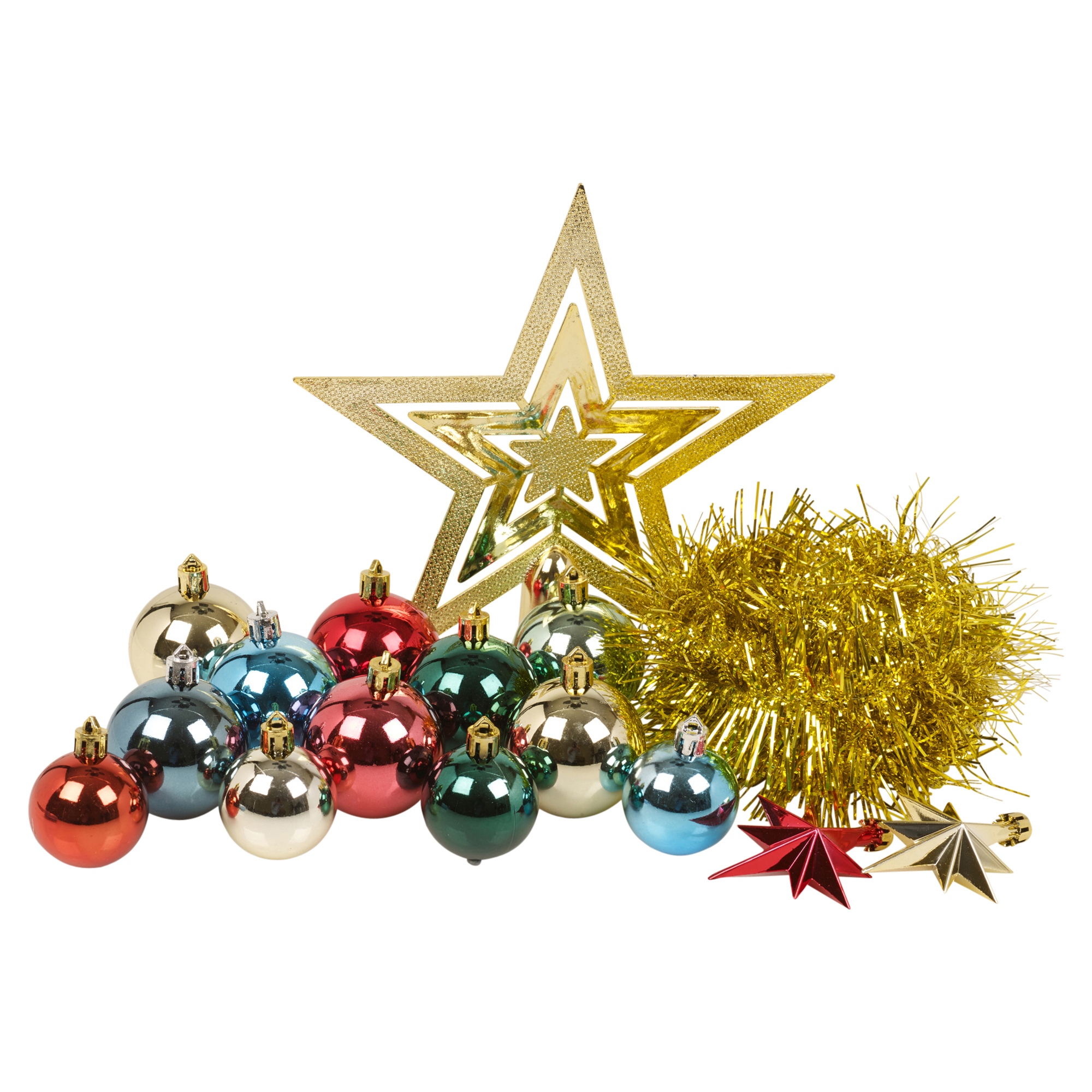 Various sets of Christmas tree hanging baubles set the perfect tree decoration! Sets of various baubles in assorted shades and sizes with glittered stars and shiny tinsel.