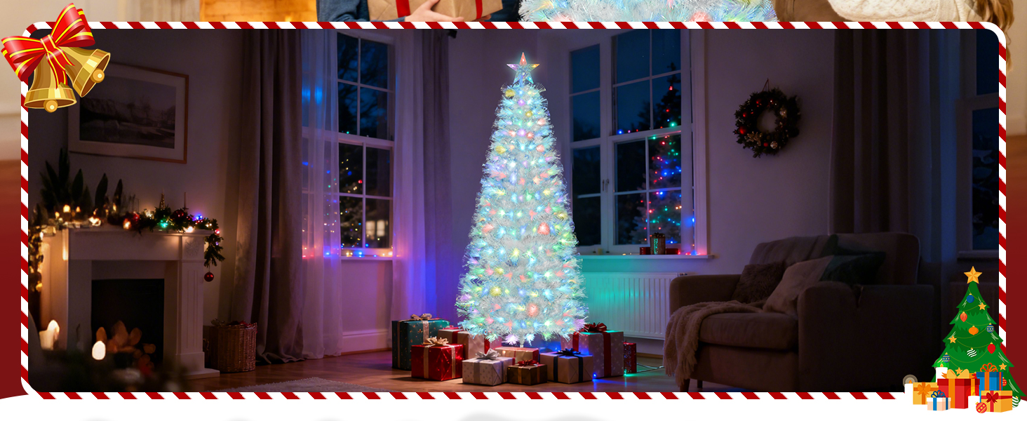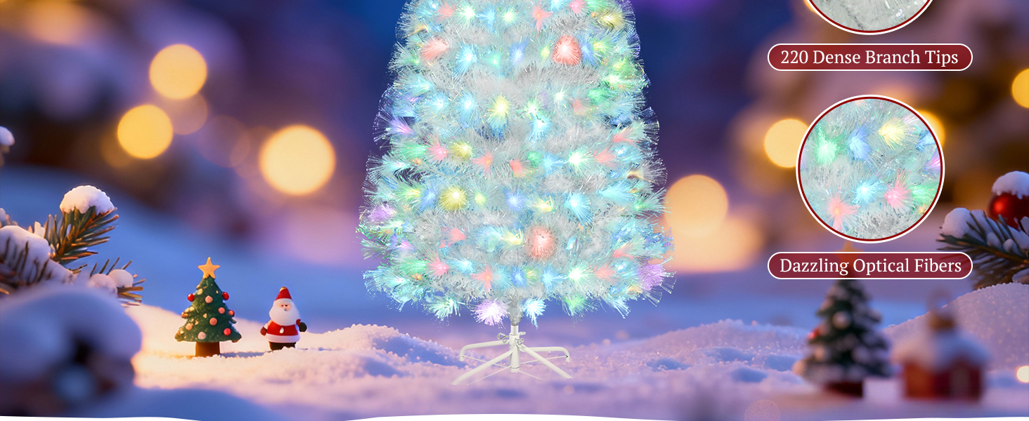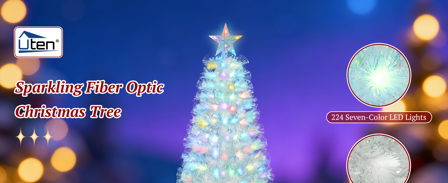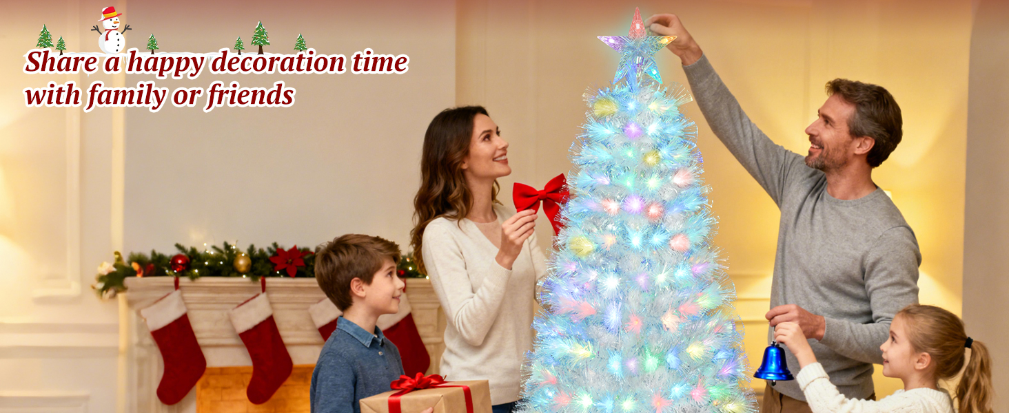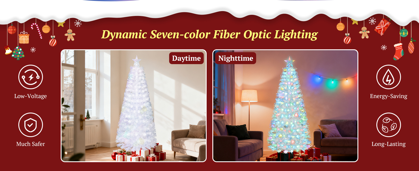 【Built-In Fibre Optic Lights】Using dynamic seven-color fiber optic lighting, the fiber optic lights will light up continuously when the Christmas tree is turned on and automatically change colors, creating a sparkling and colorful lighting effect, adding a warm and joyful atmosphere for you
